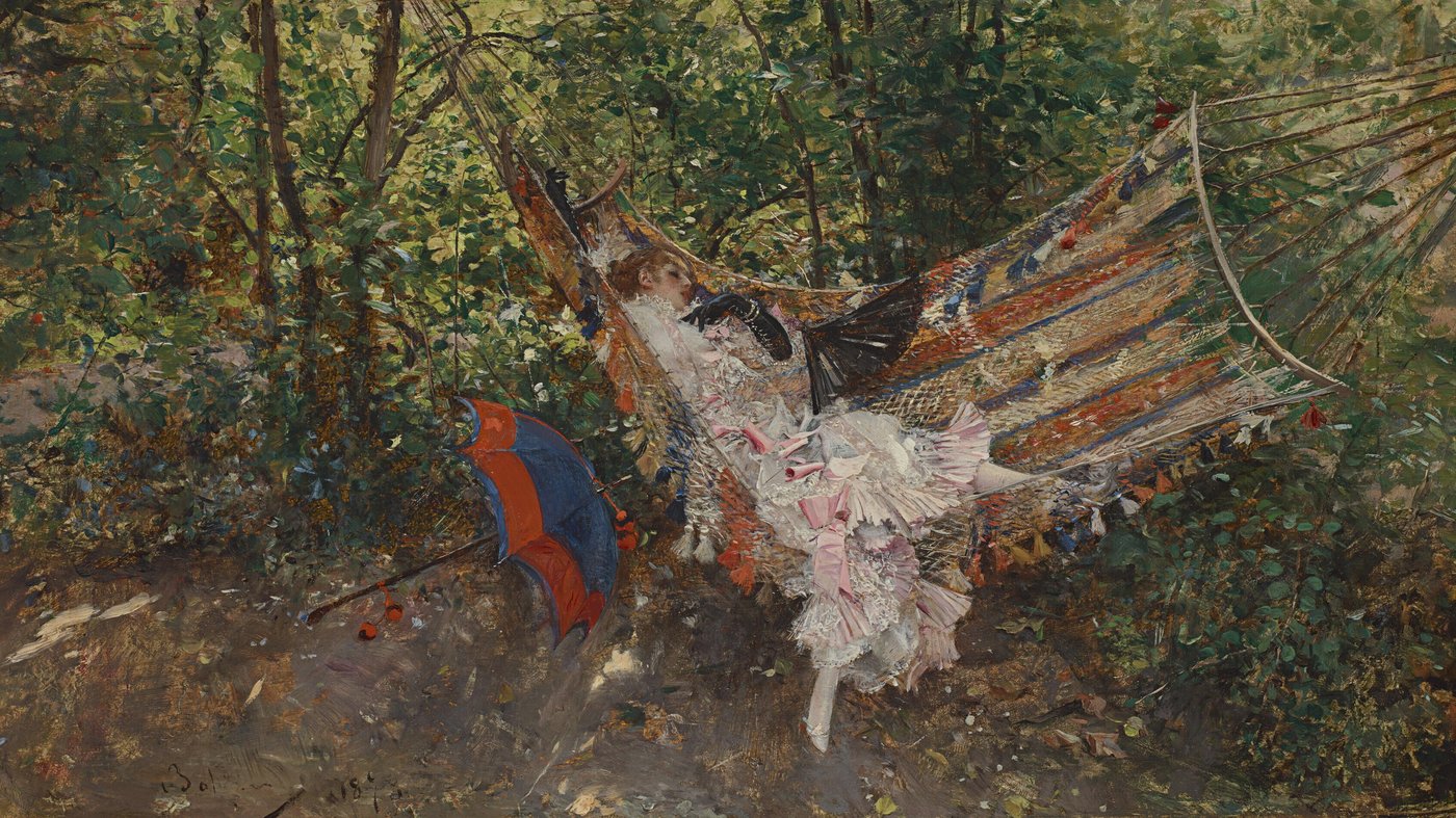 Picture a lazy afternoon in a sun-dappled garden, where a young woman lounges in a hammock, her white dress billowing around her like a cloud. Giovanni Boldini, an Italian painter known for his incredibly swift, energetic brushwork, captures this fleeting moment of leisure with remarkable spontaneity. The scene feels almost alive, as if the hammock is gently swaying and the leaves overhead are rustling in a summer breeze. Boldini's technique gives everything a shimmering, impressionistic quality that makes you feel the warmth of the day.