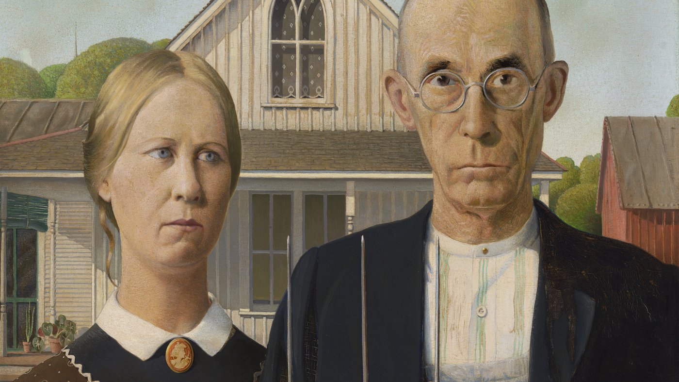 This is one of the most recognizable paintings in American art, often parodied but rarely understood. Grant Wood painted it in 1930, depicting a farmer holding a pitchfork standing beside a woman in front of a house with a distinctive Gothic-style window. The models were actually Wood's sister and his dentist, not a married couple as many assume. The woman is meant to be the farmer's daughter, though their stern expressions and rigid poses have led to endless speculation about their relationship and mood.