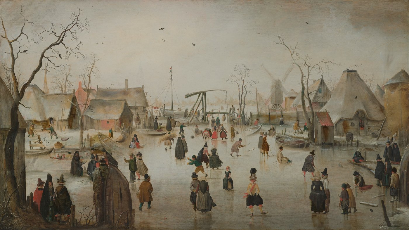 This charming winter scene captures everyday life in a frozen Dutch village during the 17th century, painted by Hendrick Avercamp, who was known as "the mute of Kampen" because he was deaf and unable to speak. The artist specialized in these lively winter landscapes, filling them with dozens of tiny figures going about their business on the ice. You can spot people skating, walking, playing games, and socializing, while bare trees and simple buildings frame the scene under a pale, overcast sky.