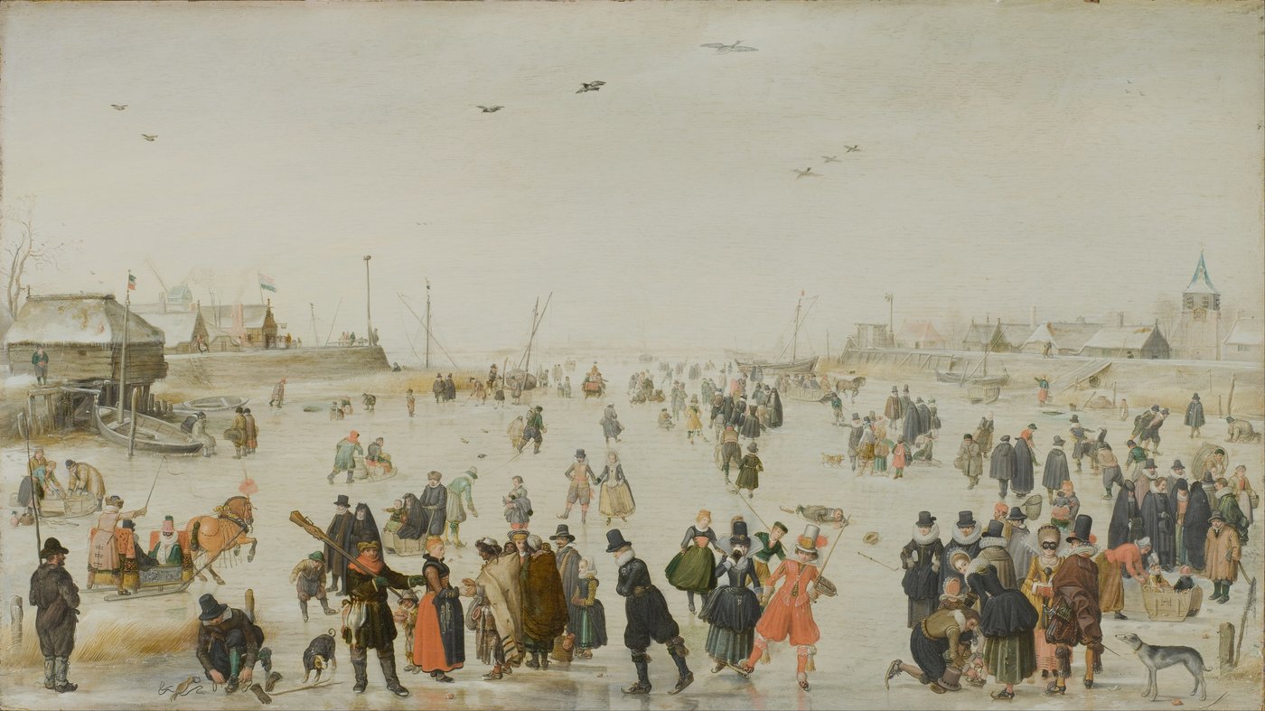 This delightful winter scene captures everyday life in the Dutch Golden Age, when frozen canals transformed into bustling highways of activity. Hendrick Avercamp, who was deaf and mute, had a special talent for observing people, and he's filled this icy landscape with dozens of tiny figures going about their business. You'll spot people skating, sledding, playing games, chatting in groups, and even a couple of dogs joining the fun. The buildings and church spires in the distance help frame this snapshot of 17th-century Dutch winter life.