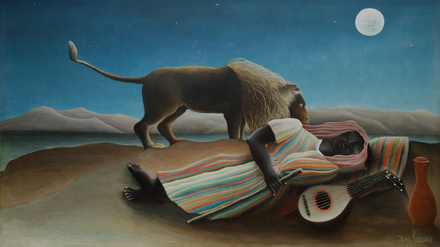 This dreamlike painting by Henri Rousseau shows a wandering musician fast asleep in a moonlit desert, while a lion stands curiously over her. The striped robe glows with vibrant colors against the pale sand, and beside the sleeping figure lies a mandolin and a small clay jar. Despite the dangerous presence of the wild animal, there's an unexpectedly peaceful quality to the scene, as if the lion is simply a guardian watching over the traveler rather than a threat.