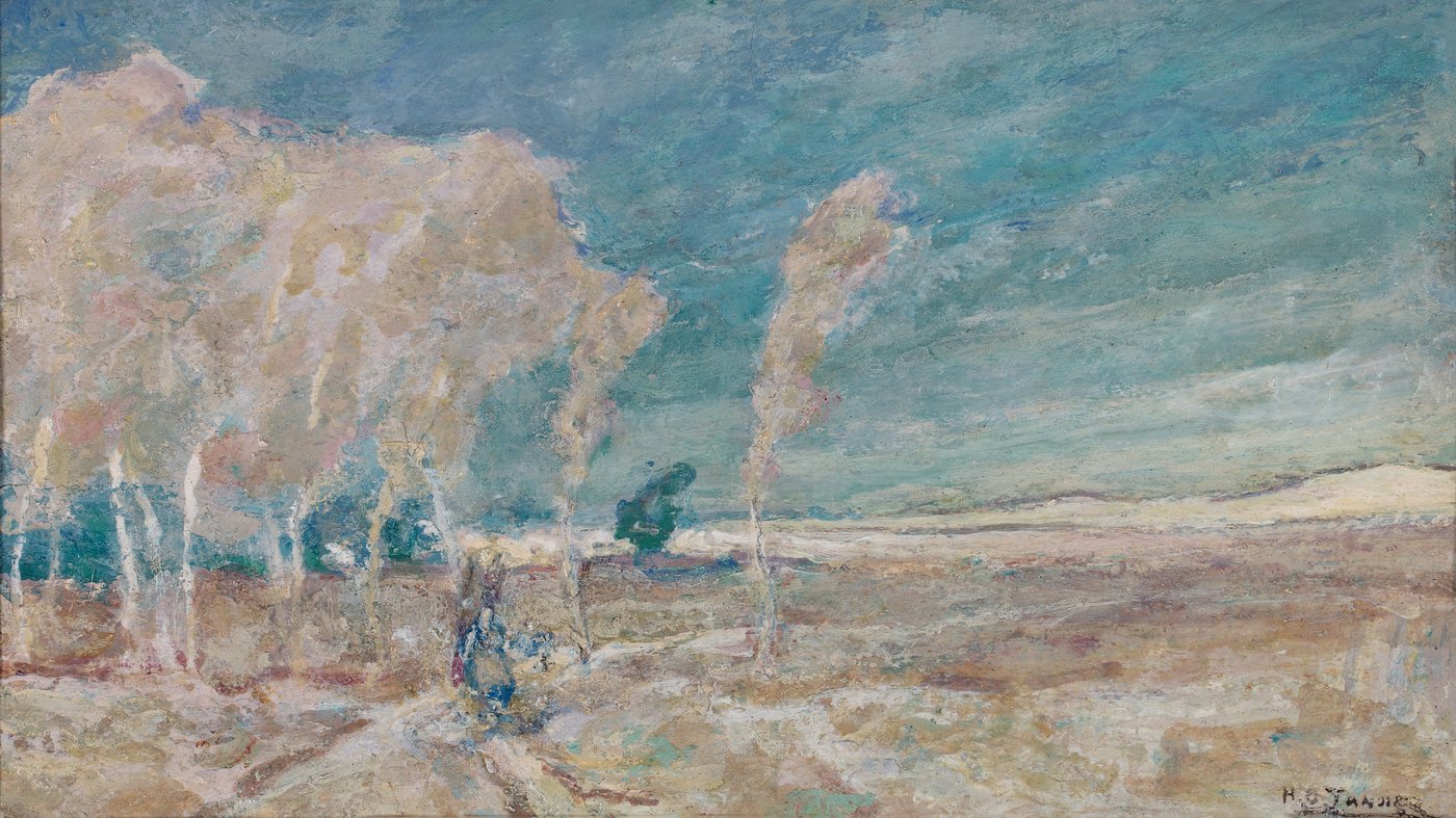 This atmospheric landscape captures the soft, hazy light of Algeria through distinctly impressionistic brushwork. Artist Henry Ossawa Tanner, an African American painter who spent much of his career in Europe and North Africa, renders the scene with a dreamy quality where pale trees seem to shimmer against a turquoise sky. A solitary figure walks along a dusty path, dwarfed by the expansive landscape that stretches toward distant horizons.