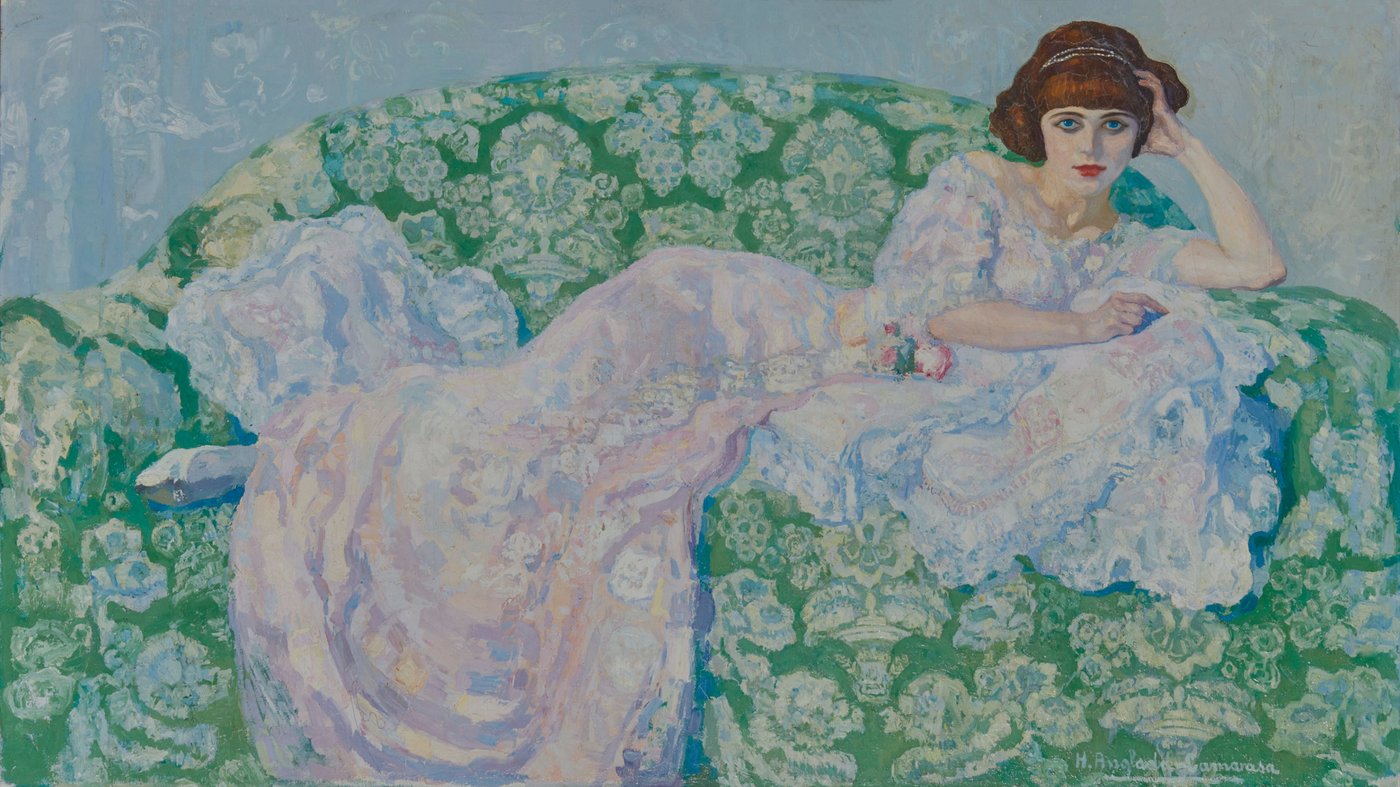 A woman in an elegant white lace gown reclines languorously on a vibrant green and white floral sofa, her head resting thoughtfully on her hand. Spanish artist Hermenegildo Anglada-Camarasa painted this work during his Paris years, when he was captivated by the city's fashionable society and theatrical world. The striking contrast between the delicate, almost transparent white dress and the bold green upholstery creates a visual harmony that's both sophisticated and daring.