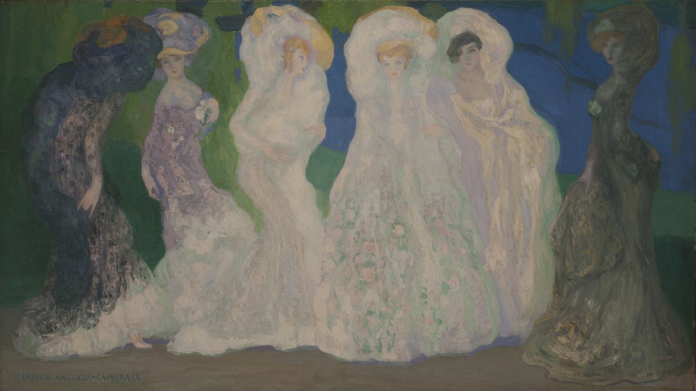 This dreamy painting by Spanish artist Hermenegildo Anglada-Camarasa captures a procession of elegantly dressed women moving through a mysterious twilight setting. The figures seem to float rather than walk, their elaborate gowns rendered in whites and pale colors that shimmer against the deep greens and blues of the background. The painting gets its title from the opal-like quality of these luminous dresses, which seem to change and glow with an inner light.