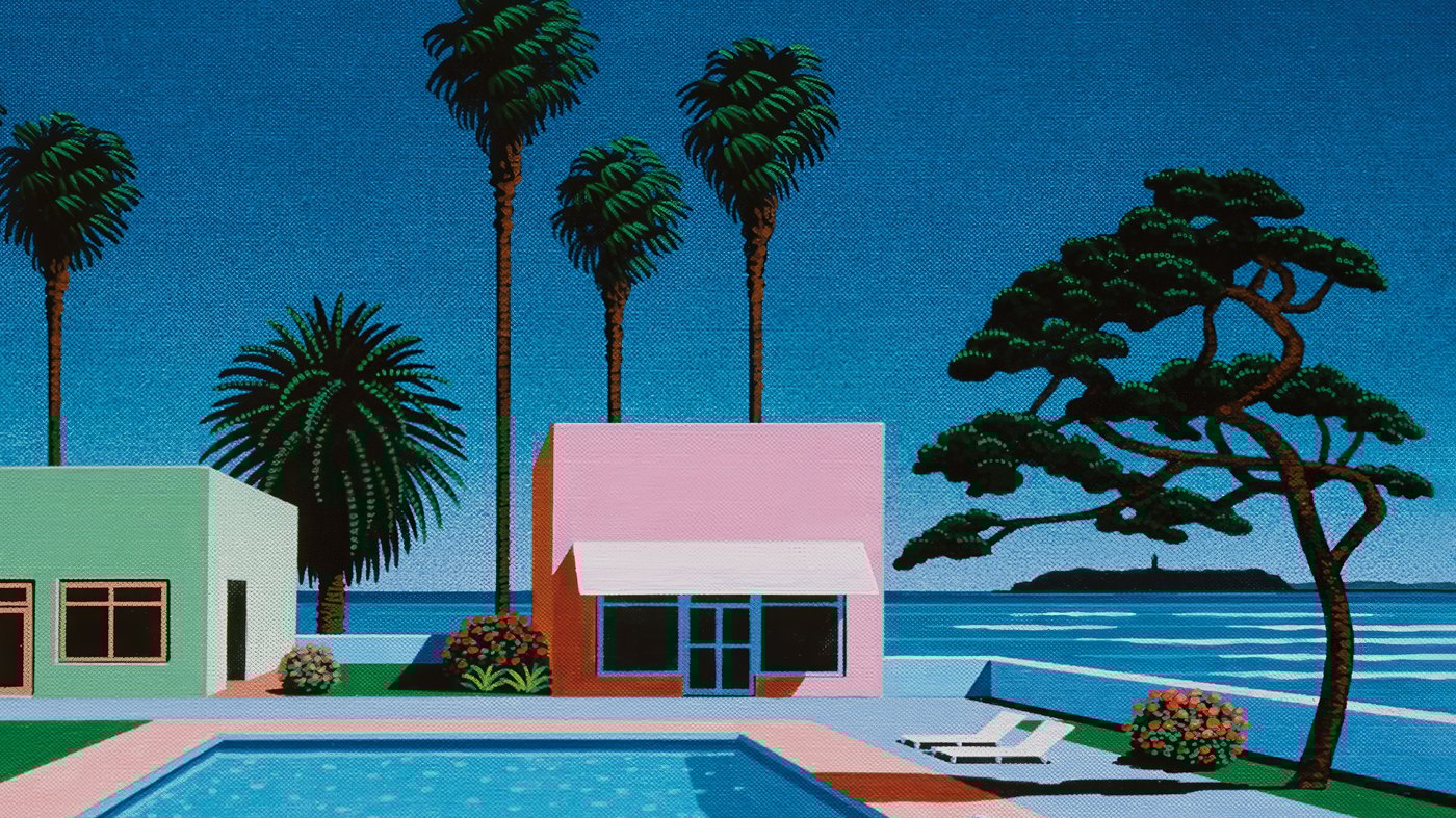 This painting captures the essence of 1980s Japanese resort culture through Hiroshi Nagai's distinctive style, which became synonymous with the "city pop" music movement of that era. The scene shows a pristine poolside retreat with pink stucco architecture, tall palms, and a glimpse of ocean beyond, all rendered in smooth, almost airbrushed colors that feel both relaxing and slightly surreal. Nagai's work appeared on countless album covers during Japan's bubble economy years, when this kind of idealized coastal lifestyle represented the country's newfound prosperity and leisure culture.