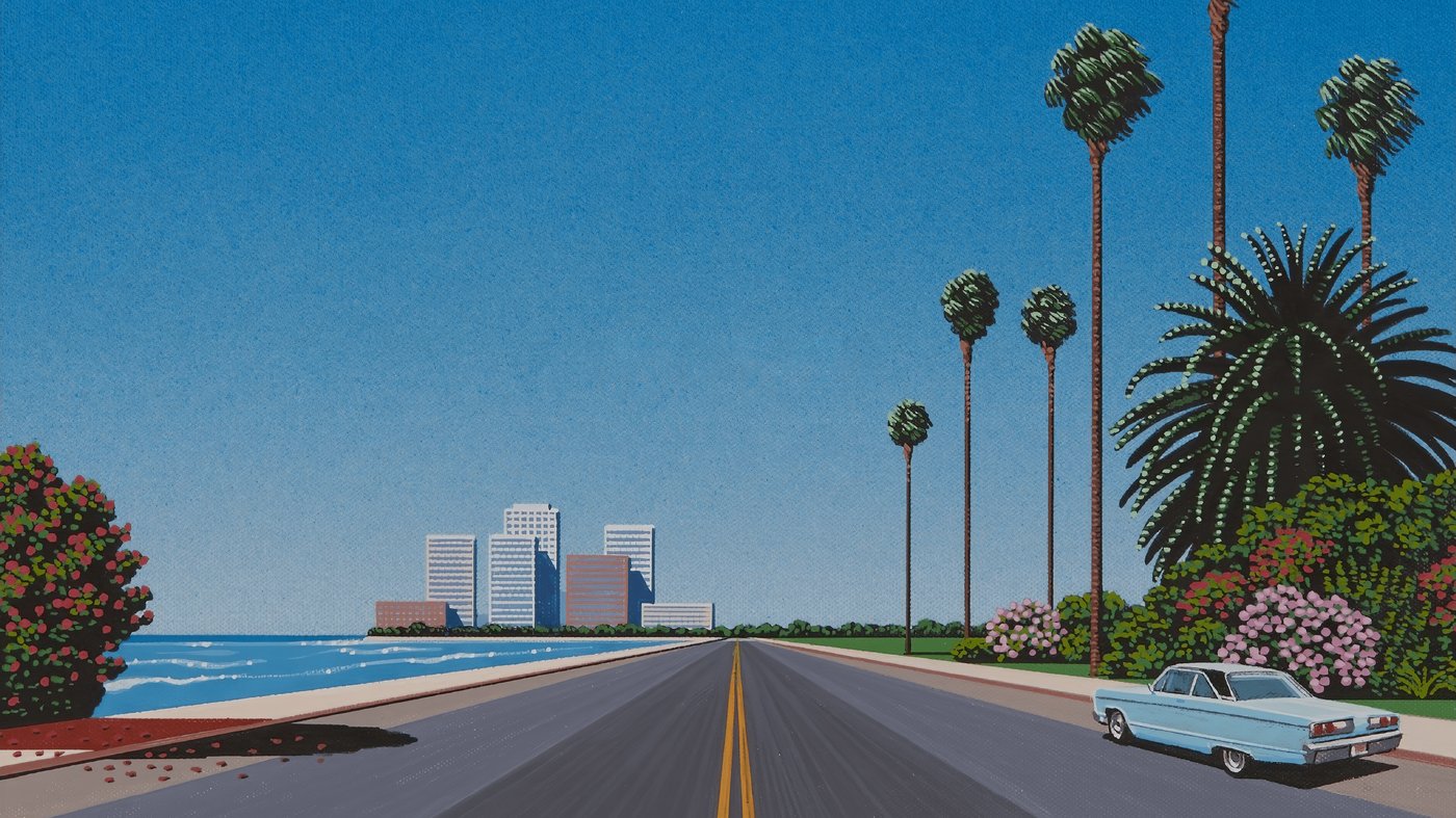 This painting captures the dreamy essence of 1980s Japanese city pop culture, a time when Japan was fascinated with idealized visions of California living. Artist Hiroshi Nagai became famous for creating these impossibly perfect scenes of coastal highways, palm trees, and distant skylines that adorned countless album covers and defined an entire aesthetic movement. His work blends reality with fantasy, presenting a California that feels more like a beautiful memory than an actual place.