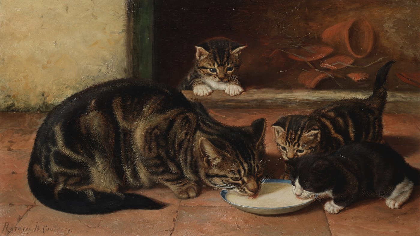 This charming Victorian painting captures a tender domestic moment as a mother cat and her two kittens gather around a saucer of milk. The artist, Horatio Henry Couldery, was known for his detailed animal paintings during the 19th century, and here he brings warmth and personality to an everyday scene. Notice how the mother cat is already lapping at the milk while one adventurous kitten joins in and another watches curiously from above on a shelf.