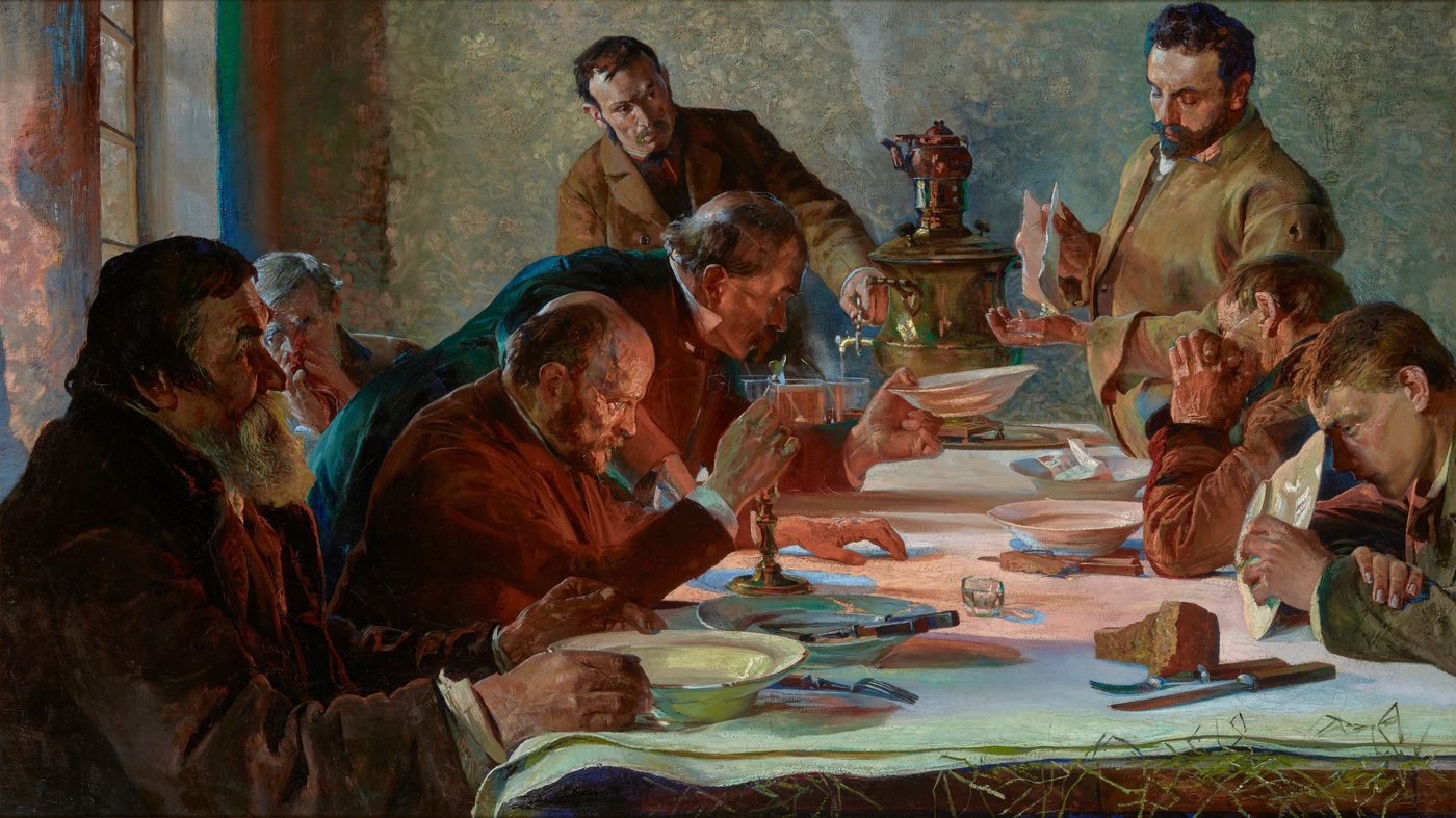 Christmas Eve in Siberia by Jacek Malczewski depicts a group of Polish political exiles sharing a Christmas Eve meal while imprisoned in Siberia under Russian rule. The men sit tightly around a long table, wearing plain, worn clothing. Their bowls are almost empty, the food sparse, and the room is bare. A samovar stands at the center, emphasizing how modest and utilitarian the setting is. This is not a home or a church, but a place of confinement, likely a barracks or makeshift dining room.