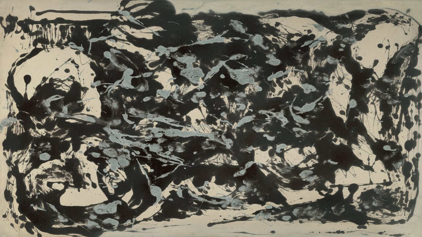 What makes this work particularly interesting is how the limited color scheme actually lets you see the layers and rhythms of Pollock's movements more clearly. You can almost follow his path around the canvas, the swoops and splatters building up a dense web of marks that seem chaotic at first but have their own kind of logic. Pollock famously said he didn't work from sketches or plans, but rather got "into" the painting, trusting his instincts to guide him. The result is something that feels spontaneous and wild but also surprisingly balanced, like visual jazz frozen in time.