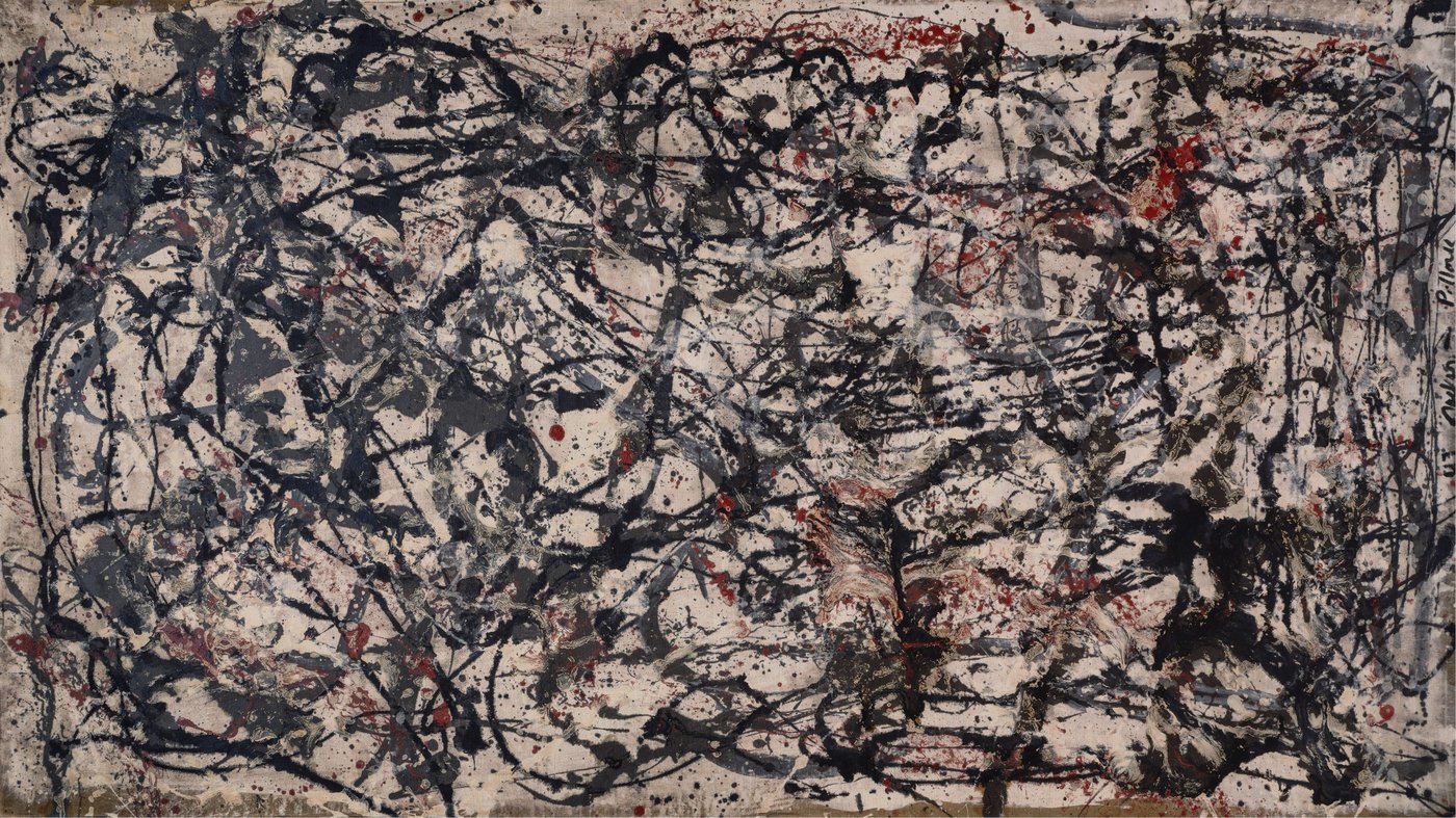 This explosive canvas shows Jackson Pollock's revolutionary "drip painting" technique in full force, where he literally poured and splattered paint onto canvas laid flat on the floor. Working in the late 1940s and early 1950s, Pollock abandoned traditional brushes and easels, instead dancing around his canvases with sticks and hardened brushes, letting paint fly in seemingly chaotic but carefully controlled gestures. The result is a dense web of black, white, and occasional red lines that seem to pulse with raw energy.