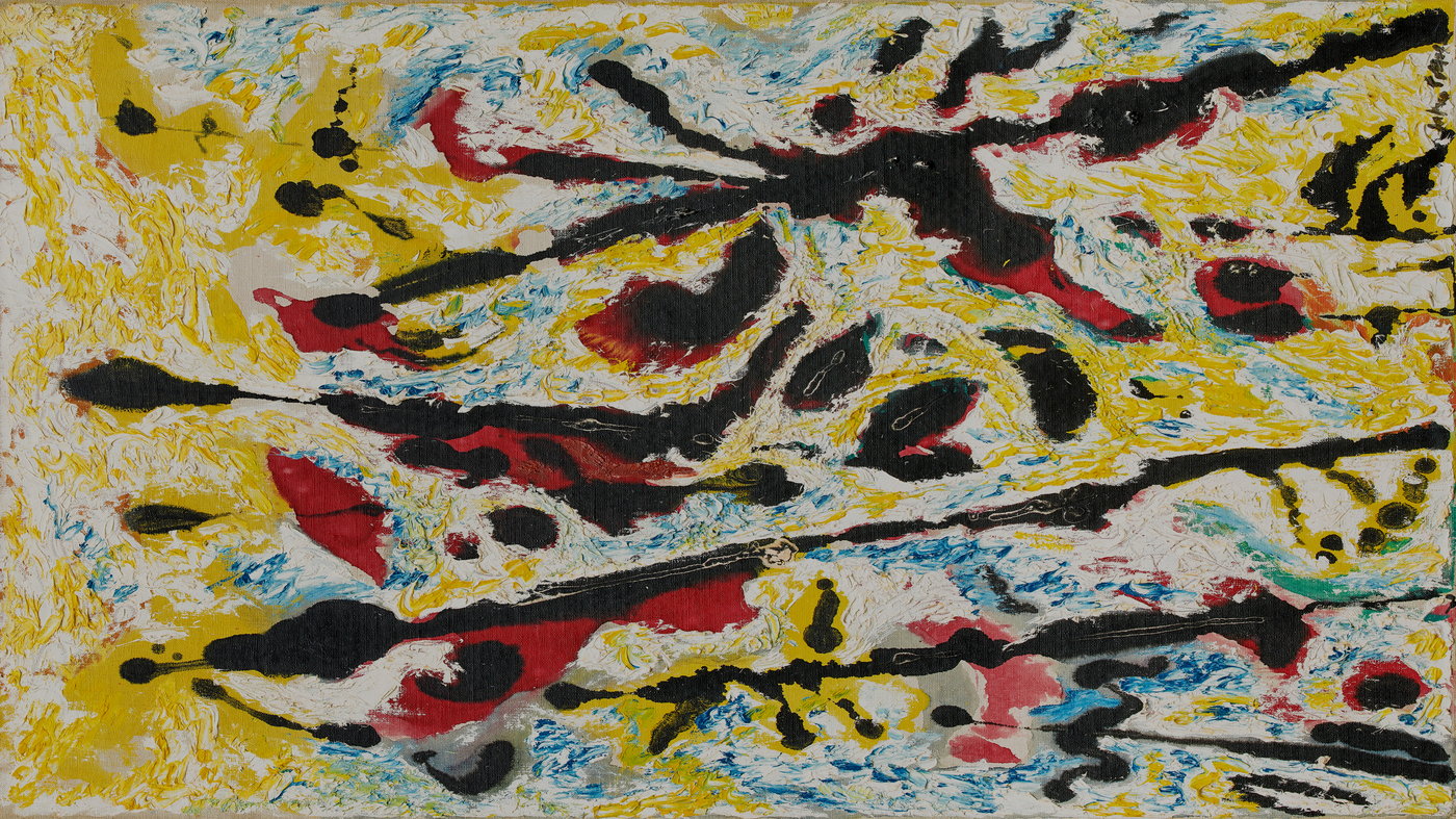 Pollock pioneered the "drip painting" technique, famously laying his canvases on the floor and moving around them as he worked, flinging and pouring paint in a physical, almost choreographed process. Here you can see his confident brushwork and spontaneous splatters creating a visual symphony. The layers of color reveal the artist's process, each mark responding to the last, building up a complex conversation between chaos and control. It's abstract expressionism at its most direct and unfiltered, capturing a moment of pure creative impulse frozen in paint.