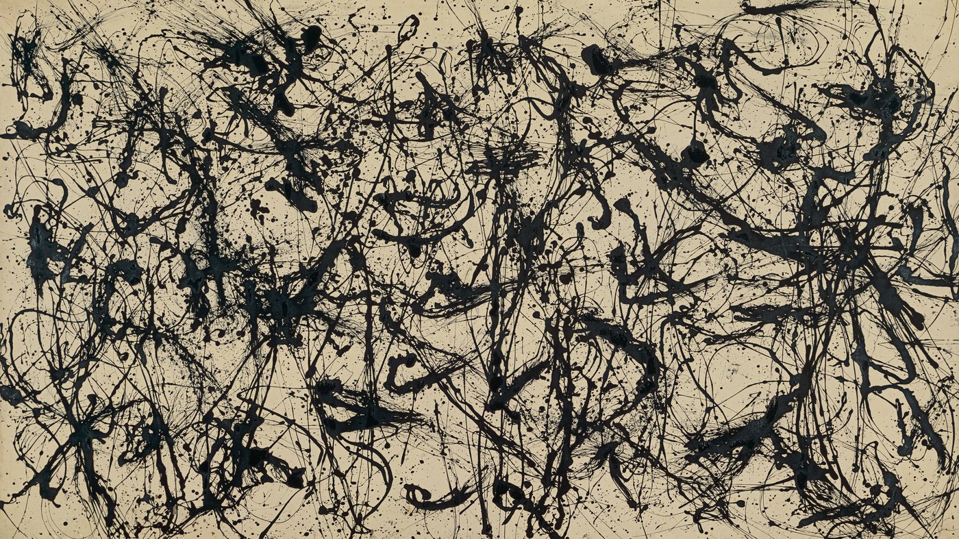This explosive canvas captures Jackson Pollock's revolutionary drip painting technique at its peak. Working on the floor rather than at an easel, Pollock would fling, pour, and drip paint directly from cans and sticks, creating intricate webs of black lines that dance and collide across the beige surface. The result is pure energy frozen in time, a visual record of his physical movements as he worked his way around the canvas.