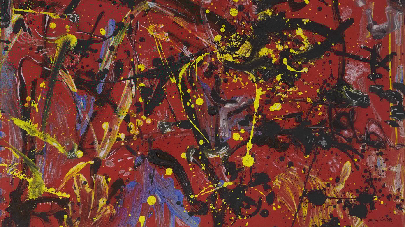 This explosive canvas showcases Jackson Pollock's revolutionary drip painting technique that shook up the art world in the late 1940s. Working on canvases laid flat on the floor, Pollock would dance around them, flinging, pouring, and dripping paint in sweeping arcs and energetic bursts. The vibrant reds dominate this piece, punctuated by brilliant yellow dots and splashes of black, purple, and orange that create a sense of controlled chaos.
