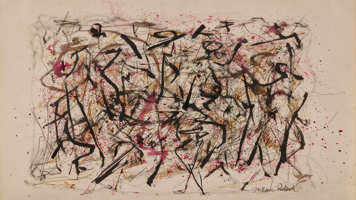 This energetic tangle of black lines and splashes of color shows Jackson Pollock's famous "drip painting" technique in action. Working in the late 1940s and 1950s, Pollock would lay his canvas on the floor and move around it, dripping and flinging paint from sticks and brushes in a kind of controlled chaos. The result here is a web of dark gestural marks accented with bursts of pink and touches of brown and yellow, creating a sense of movement that seems to pulse across the surface.