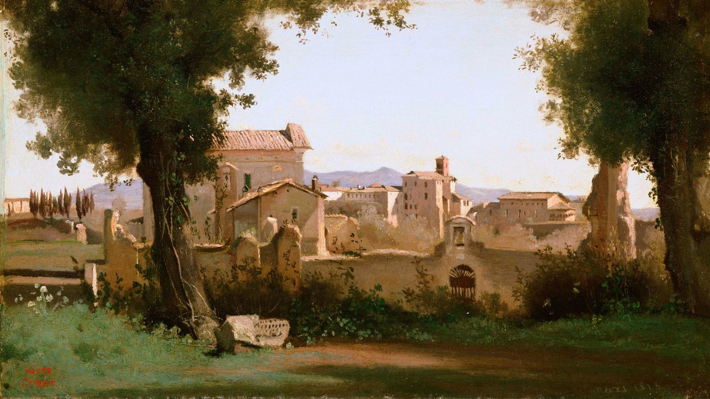 This painting, View from the Farnese Gardens, Rome, was created by Corot around 1826. It belongs to the period when he was a young artist studying in Italy, a common and necessary trip for serious landscape painters of the time.