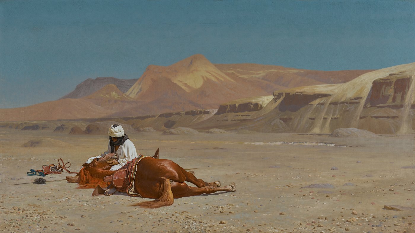 Painted by Jean Léon Gérôme, the work reflects his fascination with travel, endurance, and solitary life in arid regions. The wide horizon and layered hills emphasize scale and isolation, making the figures appear small against nature’s vastness. Gérôme’s careful detail gives the scene a sense of realism, yet it also carries a quiet idealism. The desert becomes a place of stillness rather than danger, and the rider’s wait feels thoughtful rather than desperate. Through this calm interlude, the painting invites viewers to slow down and notice the dignity found in rest, patience, and survival.