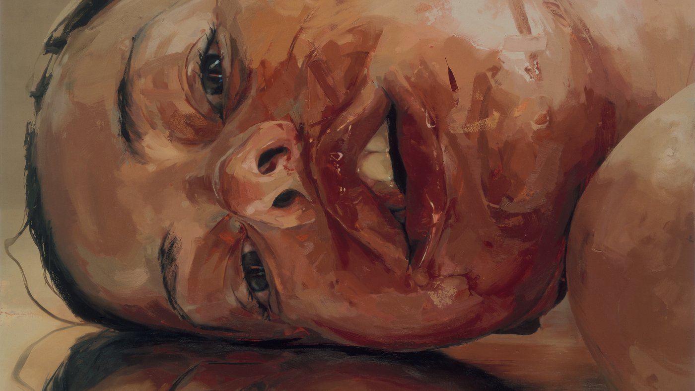 This striking close-up belongs to Jenny Saville's bold exploration of the human body, painted with unflinching honesty and raw physicality. The artist has turned the face upside down, forcing us to see familiar features in an unsettling new way. The flesh appears vulnerable and exposed, painted in thick, gestural strokes that emphasize weight, texture, and the body's sheer materiality. Saville doesn't shy away from showing skin as it really is: soft, folded, and imperfect.