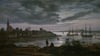 This atmospheric painting by Norwegian artist Johan Christian Dahl captures the harbor town of Larvik under moonlight, with sailing ships resting quietly in the water and dramatic clouds sweeping across the sky. Dahl, often called the father of Norwegian landscape painting, was a master of the Romantic movement who spent much of his career documenting the natural beauty and changing moods of Scandinavian coastal scenes during the 1800s.