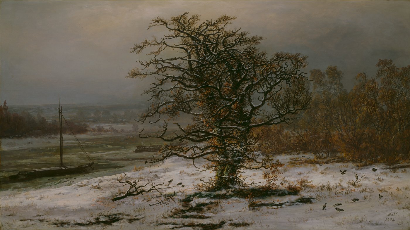 This stark winter scene captures a solitary oak tree standing resilient against the cold, painted by Norwegian artist Johan Christian Dahl in the 1820s. The gnarled, nearly bare branches reach out dramatically against an overcast sky, while patches of snow cover the ground around its base. Dahl was known as the father of Norwegian landscape painting, though he spent much of his career in Dresden, Germany, where he painted this view of the Elbe River valley.