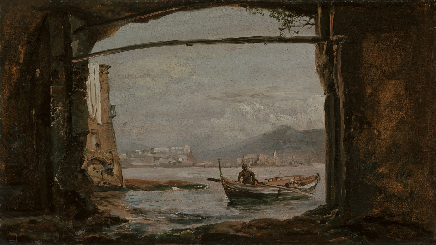 Norwegian artist Johan Christian Dahl painted this scene during his travels in Italy around 1820, when artists from across Europe were drawn to the Mediterranean's classical ruins and dramatic landscapes. The area near Posillipo, just outside Naples, was famous for its natural grottoes and spectacular views. Dahl was known for his romantic landscapes and his careful attention to light and atmosphere, which is evident here in how he captures the humidity in the air and the way daylight filters into the cave's darkness. It's a quiet, contemplative moment that invites us to pause and appreciate the simple beauty of a fisherman's daily life against the backdrop of one of Italy's most celebrated coastlines.