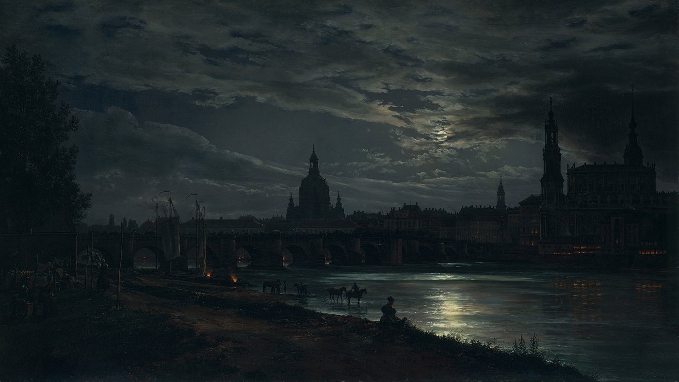 This moody nighttime scene captures Dresden, one of Germany's most beautiful cities, bathed in silvery moonlight. Norwegian artist Johan Christian Dahl painted this atmospheric view in the 1830s, when he was living in Dresden and becoming one of the leading figures of Romantic landscape painting. The moon breaks through dramatic clouds, casting shimmering reflections across the River Elbe while the city's distinctive spires and towers rise mysteriously in the darkness.