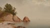 This peaceful coastal scene captures a quiet moment on the Massachusetts shore, where rocky outcrops meet calm waters under a hazy sky. A lone figure stands near two beached boats, dwarfed by the natural landscape that surrounds them. In the distance, a sailing vessel appears almost ghostlike through the atmospheric mist, adding to the sense of solitude and contemplation.