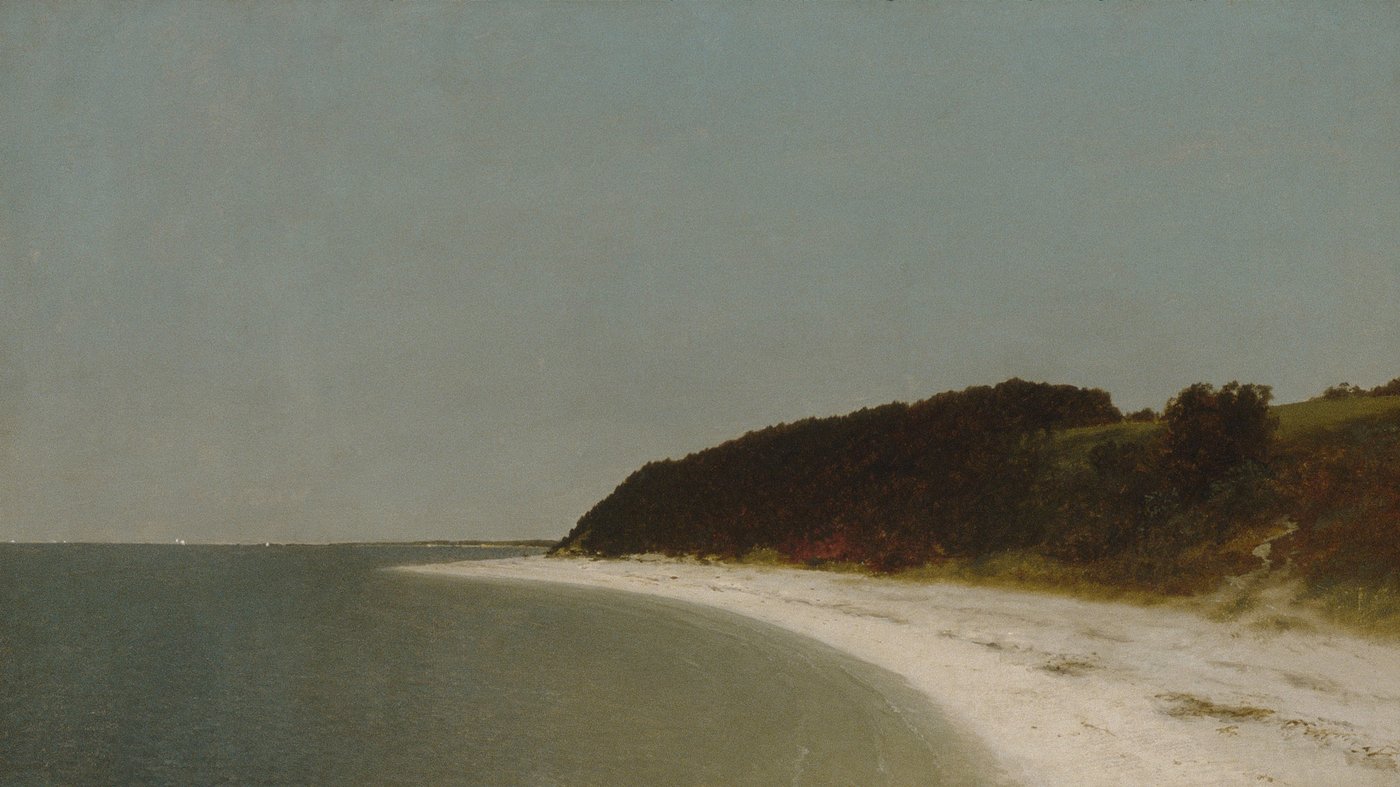 This serene coastal view captures a quiet stretch of shoreline along Long Island Sound, painted by John Frederick Kensett, one of America's leading landscape artists of the mid-1800s. Kensett was a master of what's called Luminism, a style that emphasized calm, glowing light and a sense of tranquil stillness. Here, he presents nature stripped down to its essentials: a gentle curve of white sand, a dark wooded bluff, and the subtle gradations of sea meeting sky.