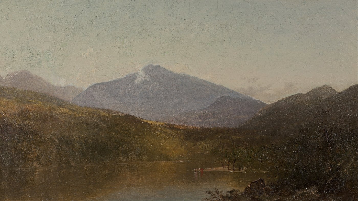 The composition is quietly balanced, with dark forested hills framing a calm body of water in the foreground and the majestic mountains rising in the background. Unlike some of his contemporaries who favored dramatic, almost theatrical landscapes, Kensett preferred a more understated approach. He was known for his luminous skies and tranquil scenes that invited contemplation rather than awe. This painting reflects the 19th-century American belief that nature was a source of spiritual renewal and national pride, though it presents this idea with a gentle touch rather than grand gestures.