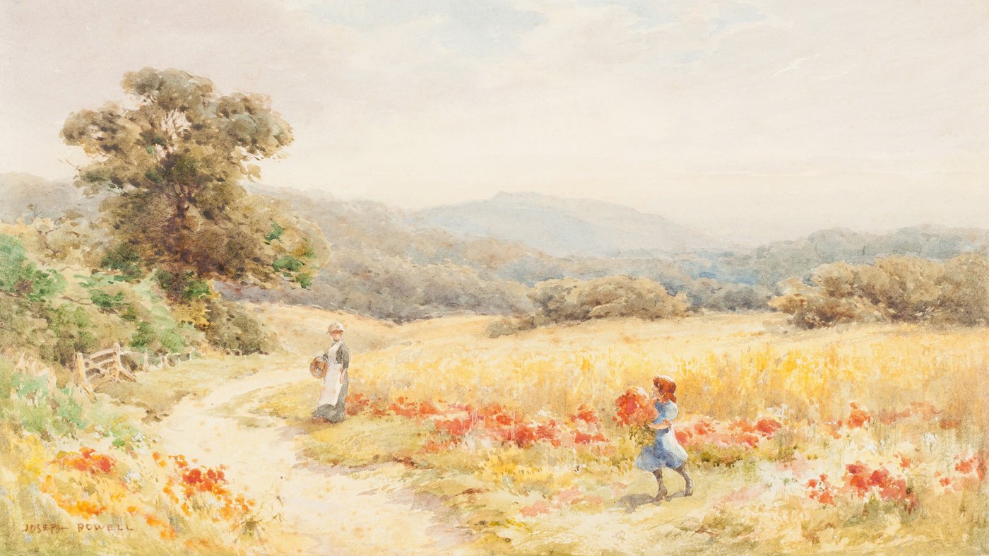 Joseph Rubens Powell was a British watercolorist working in the late 19th and early 20th centuries, and his work reflects the pastoral romanticism popular during that era. Notice how he uses delicate washes of color to create depth and atmosphere, with the landscape becoming progressively lighter and hazier as it recedes. The poppies provide vibrant splashes of color against the muted golds and greens, drawing the eye through the composition. It's the kind of scene that celebrates the simple beauty of the English countryside, a common theme for artists who wanted to preserve a vision of rural life that was already beginning to change with industrialization.