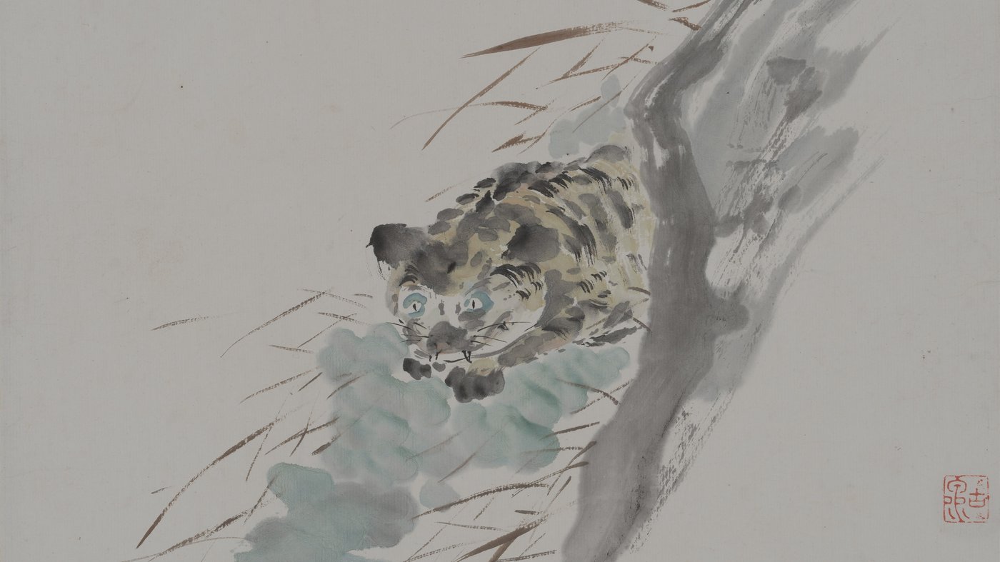 This wonderfully loose and spontaneous tiger painting comes from the brush of Ju Lian, a Chinese artist working in the late 19th and early 20th centuries. Using the traditional ink and wash technique, the artist captures a tiger in a moment of repose, draped across what appears to be a rocky outcrop or hillside. The minimal use of color, just touches of blue-green and brown, lets the fluid brushwork do most of the talking.
