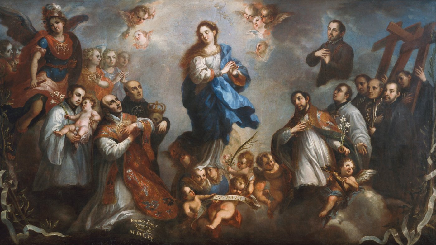Painted by Juan Francisco de Aguilera, the work reflects the strong role of the Jesuit order in promoting the doctrine of the Immaculate Conception in Spain. The painting blends theology with emotion, using soft light, movement, and rich color to express spiritual ascent rather than strict narrative. It is meant to inspire contemplation and faith, presenting belief as something uplifting and shared, carried upward through community, learning, and devotion.