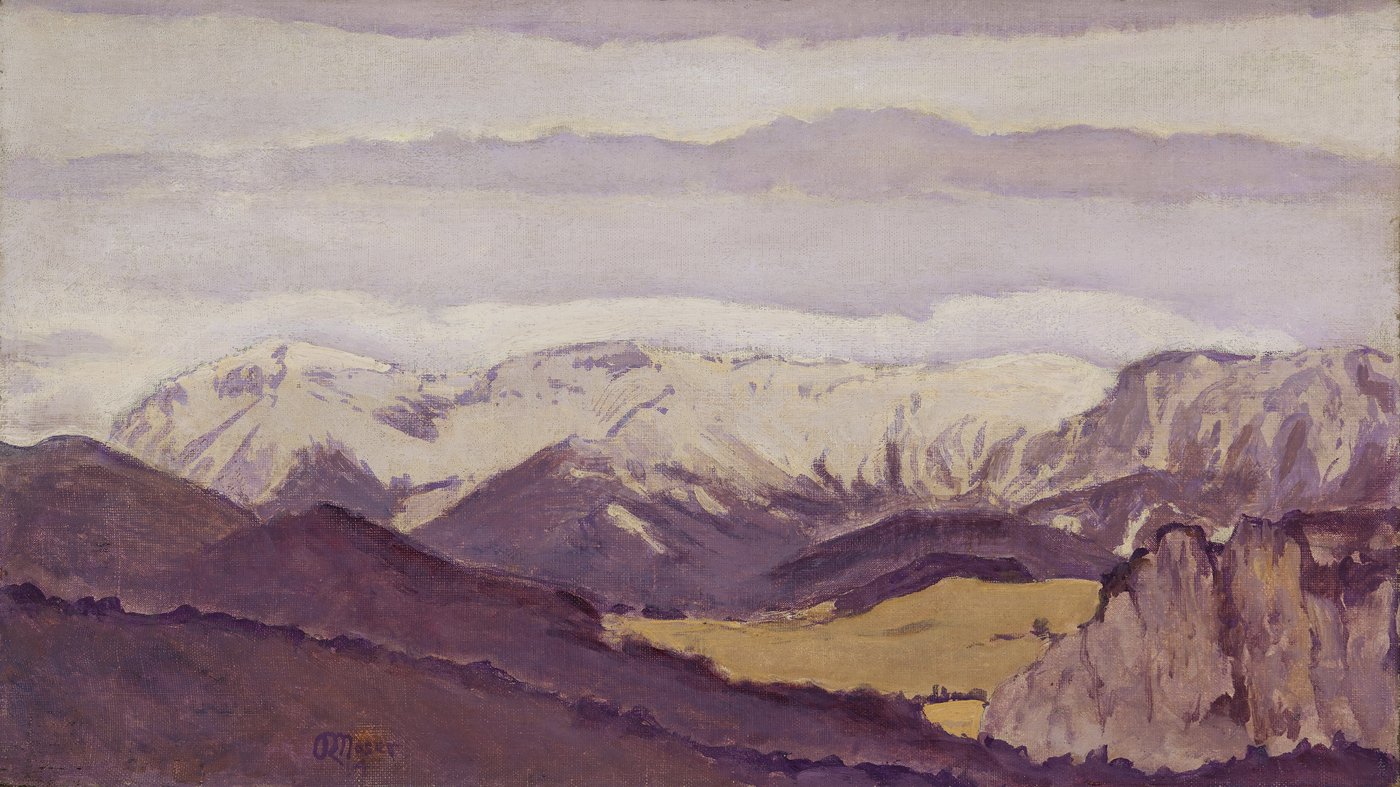 What makes this work interesting is how Moser simplifies the landscape into broad, flat areas of color, treating the mountains almost like shapes on a decorative panel. The snow appears as pale streaks against the darker rock faces, while the foreground layers itself in bands of color that feel more designed than strictly naturalistic. There's a quietness to the scene, emphasized by the overcast sky and the way everything seems to settle into horizontal rhythms. It's a view that feels contemplative rather than dramatic, showing nature through the eyes of an artist who spent much of his career thinking about pattern, surface, and the arrangement of forms.