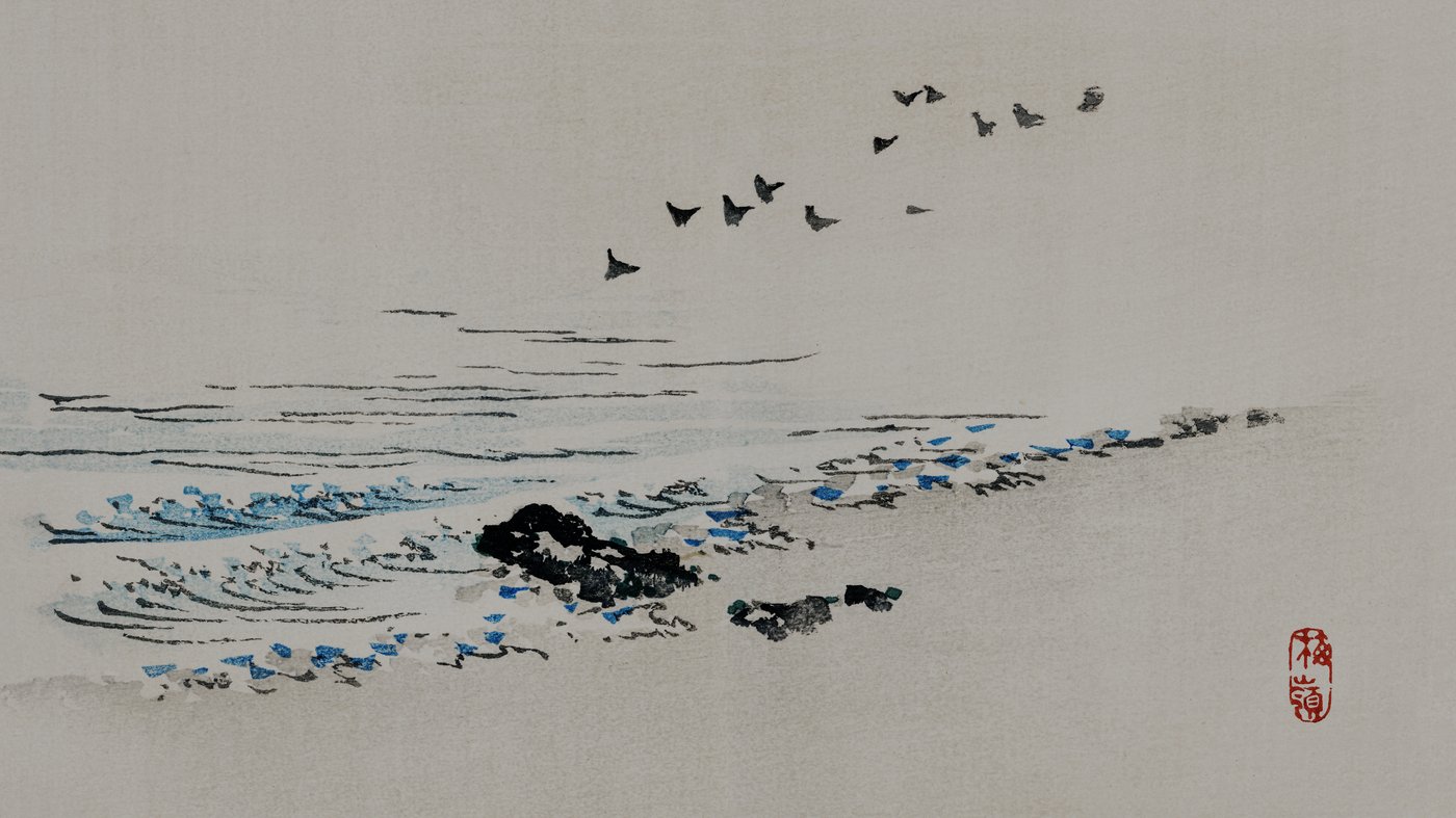 This serene Japanese woodblock print captures a quiet moment at the shoreline with remarkable economy of line. Artist Kōno Bairei, who worked during the Meiji period, was known for his naturalistic depictions of birds and landscapes. Here, he uses minimal brushstrokes to suggest waves lapping at dark rocks, with small touches of blue indicating the movement of water. A flock of birds flies overhead, their silhouettes adding life and movement to an otherwise still scene.