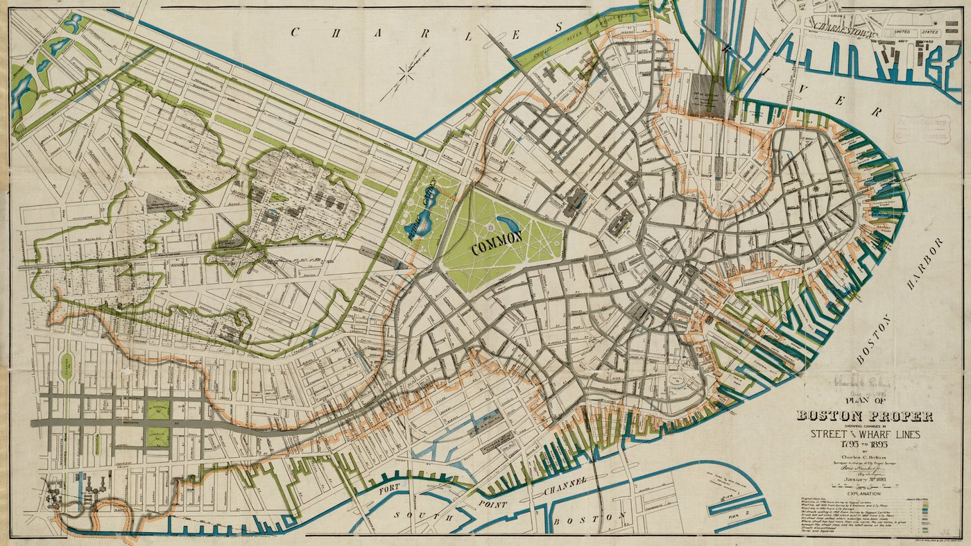 Plan of Boston Proper showing changes in street and wharf lines, 1895