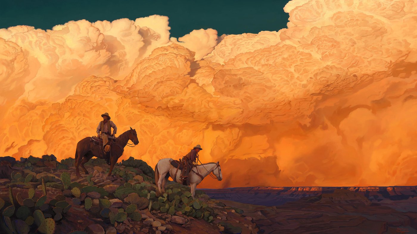 Two riders on horseback pause at the edge of a dramatic landscape, silhouetted against an extraordinary sky that dominates the entire scene. The clouds billow and roll in warm shades of orange, peach, and amber, creating an almost apocalyptic atmosphere that suggests either an intense sunset or perhaps distant wildfire smoke. The composition draws your eye across the rugged, cactus-dotted terrain toward distant mesas on the horizon.