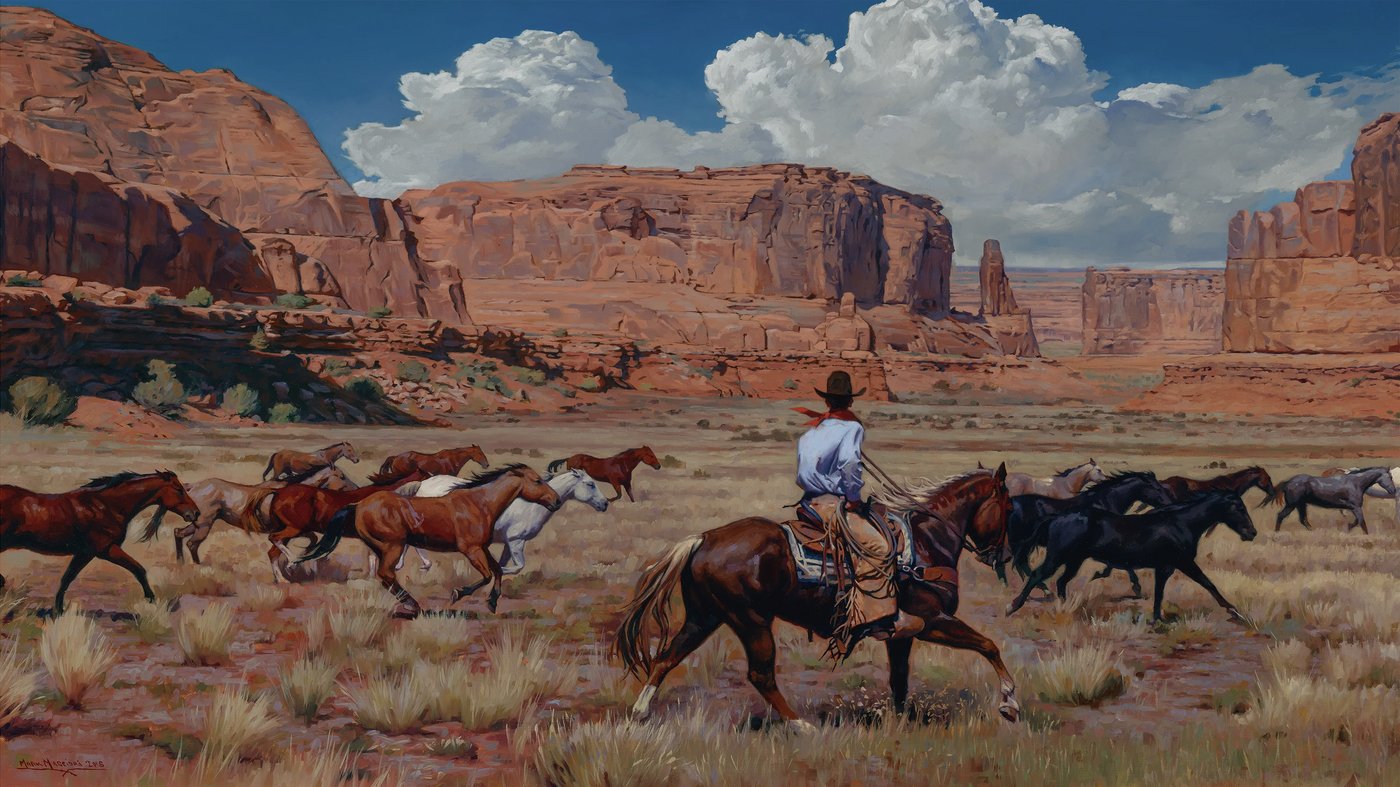 Mark Maggiori is a contemporary French-American artist who has become known for his romantic yet realistic depictions of the modern American West. He brings a cinematic quality to his work, almost like a freeze-frame from a classic Western film, but painted with the eye of someone who genuinely loves this landscape and lifestyle. The warm earth tones and dramatic sky give the painting an almost nostalgic feeling, celebrating a way of life that still exists but feels increasingly rare in our modern world.