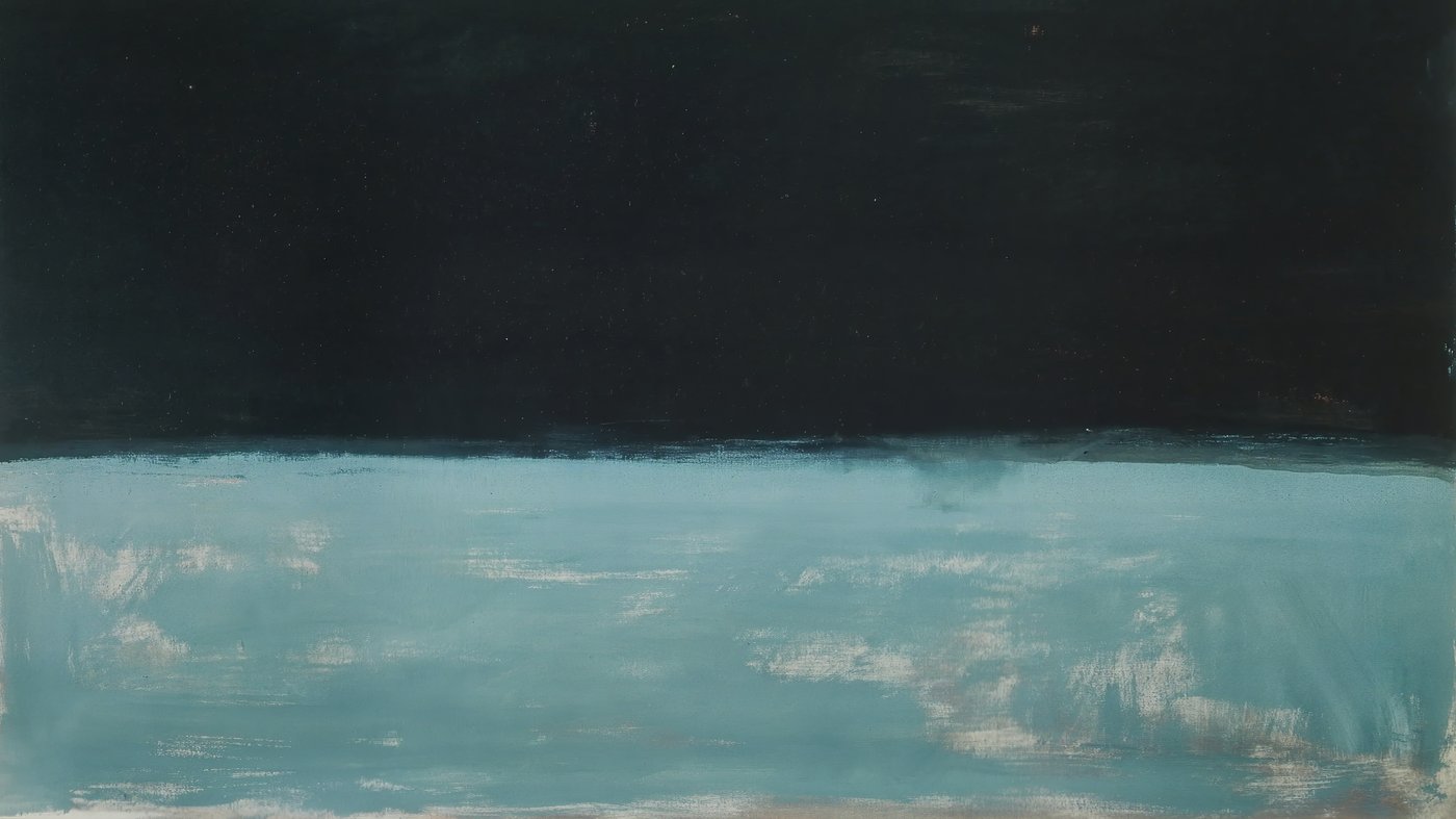 This painting strips away almost everything to create something surprisingly powerful. Mark Rothko, working in his signature abstract expressionist style, divides the canvas into just two zones: a brooding, nearly black upper section and a luminous turquoise-green field below. The boundary between them feels both solid and uncertain, like a distant horizon line or perhaps the meeting of sea and stormy sky.
