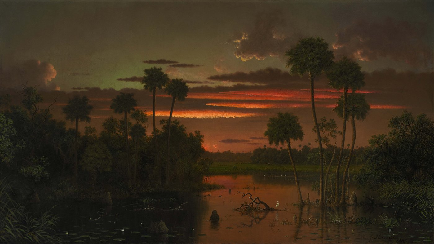 This moody Florida landscape captures the wild, untamed character of the state long before theme parks and beach resorts. Martin Johnson Heade painted this scene in the 1880s, when much of Florida was still mysterious wetlands and dense tropical vegetation. The dramatic sunset casts an almost supernatural glow across the water, while palm trees stand like silent sentinels in the gathering darkness.