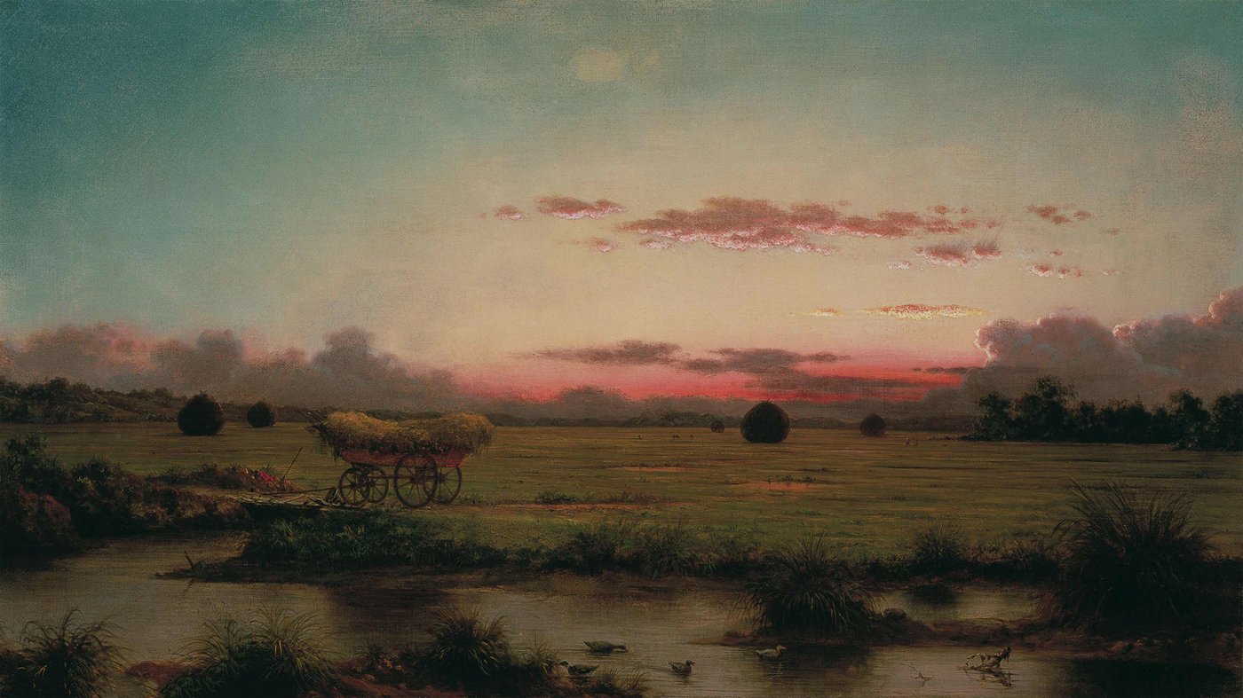 This tranquil landscape captures the salt marshes of Rhode Island at that magical moment when daylight fades into dusk. Martin Johnson Heade, a 19th-century American painter, became famous for his marsh scenes, and this painting shows exactly why. The pink and orange glow along the horizon reflects softly on the water below, while a hay wagon sits peacefully in the middle distance. Everything feels still and quiet, as if time has paused for the evening.