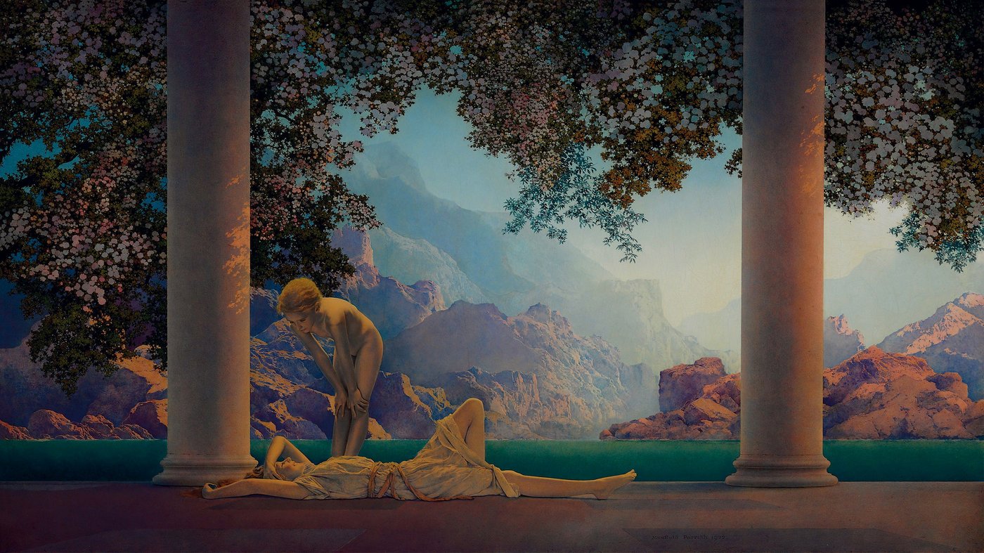 This dreamy 1922 painting by Maxfield Parrish became one of the most reproduced artworks of its time, hanging in countless American homes during the 1920s and 30s. Parrish was famous for his distinctive luminous blue skies and idealized classical scenes, and this work captures both perfectly. Two figures rest on a marble terrace framed by tall columns, gazing out at a fantastical landscape of mountains and ancient trees bathed in golden morning light.