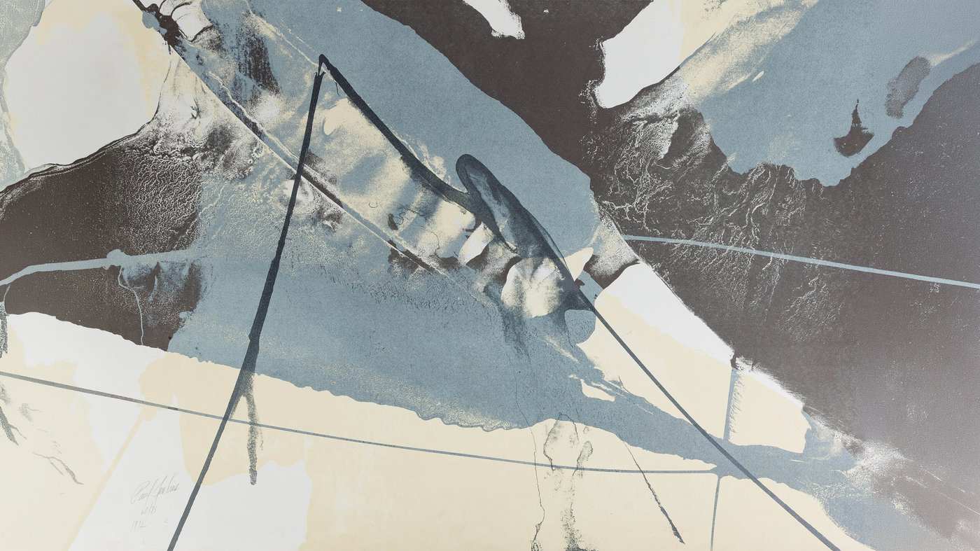 This abstract winter landscape captures the season's essence through sweeping gestures of paint in cool blues, grays, and creamy whites. Paul Jenkins, an American abstract expressionist, was known for pouring diluted paint onto canvas and manipulating it with tools and gravity, creating these fluid, almost watercolor-like effects. The diagonal lines cutting through the composition suggest bare branches or the sharp angles of a winter landscape, while the muted palette evokes snow, ice, and overcast skies.