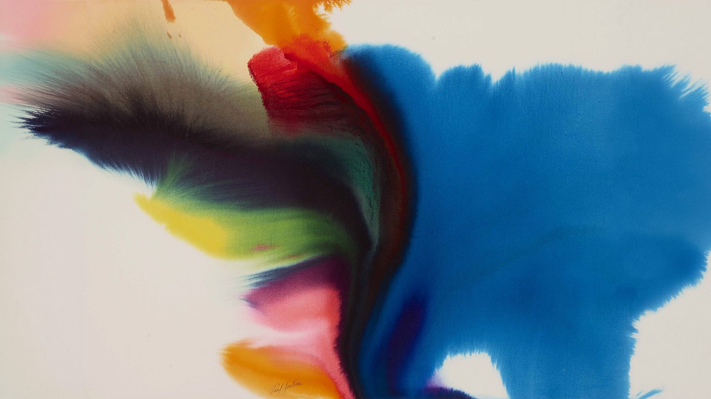 This striking abstract painting showcases Paul Jenkins's unique approach to color and movement, created using his signature technique of pouring and tilting thinned paint across the canvas. The vibrant blue dominates the right side like a billowing cloud, while jewel-toned layers of yellow, pink, green, and red seem to twist and flow together on the left, creating an almost liquid sense of motion. Jenkins was fascinated by the unpredictable nature of his process, allowing gravity and the paint's natural fluidity to guide the composition.