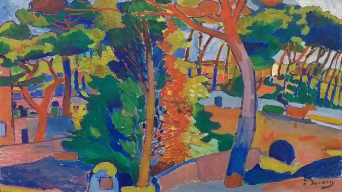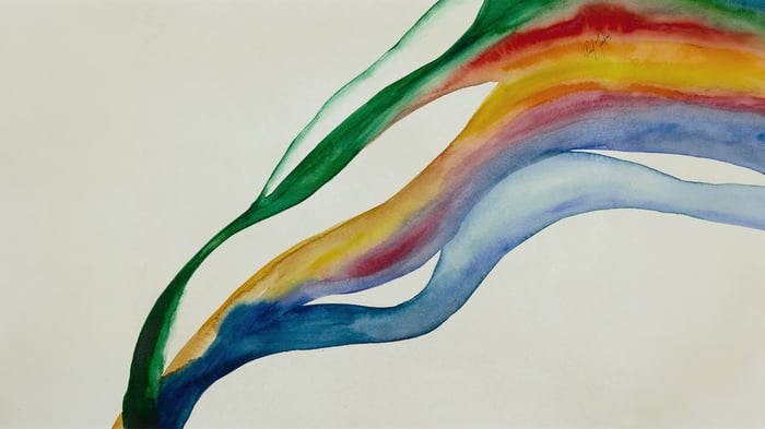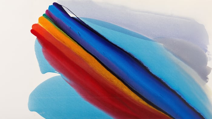 This vibrant abstract painting showcases Paul Jenkins's signature technique of pouring thinned acrylic paint onto canvas and letting gravity and chance guide the flow. The American artist, who spent much of his career in Paris, developed this distinctive method in the 1950s, creating luminous veils of color that blend and separate in unexpected ways. Here, brilliant reds and pinks cascade from the upper left while cool blues and teals drift across the composition like translucent fabric caught in motion.