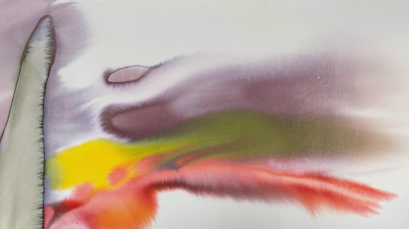 This luminous abstract painting showcases Paul Jenkins's distinctive "pour and tilt" technique, where he would carefully manipulate liquid paint across the canvas to create flowing, organic forms. The soft washes of purple and grey seem to float above bold strokes of yellow, orange, and coral red, creating a sense of atmospheric depth and movement. Jenkins was fascinated by the way colors could bleed into one another, surrendering some control to let the paint itself determine the final composition.