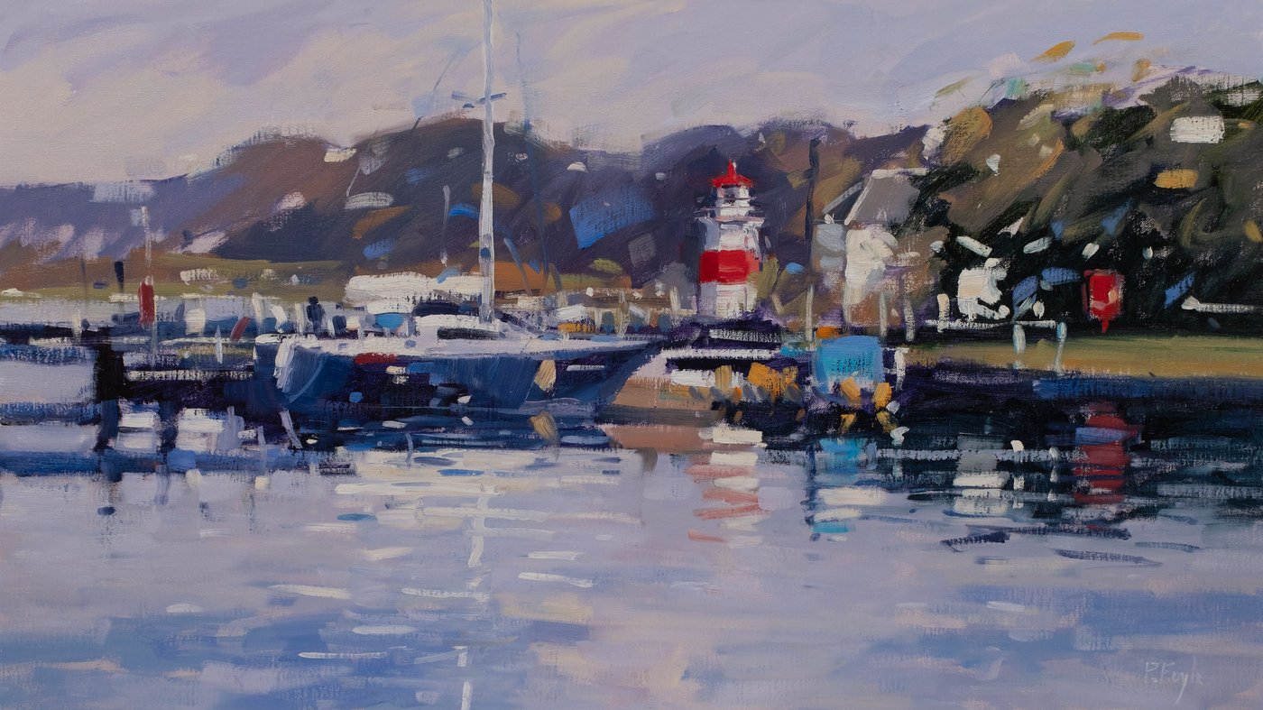 This harbor scene captures the quiet charm of Crinan, a small village on Scotland's west coast where the Crinan Canal meets the sea. The painting focuses on a distinctive red and white striped lighthouse standing sentinel among moored boats, with houses nestled into the hillside behind. The artist works with bold, confident brushstrokes that give the water a lovely rippling quality, reflecting the boats and sky in loose patches of blue, white, and purple. Peter Foyle paints in an impressionistic style that values atmosphere and light over precise detail. Notice how he builds up the scene with blocks of color rather than careful lines, letting your eye blend the strokes together from a distance. The technique gives the whole painting a sense of movement and life, as if you're looking at the harbor through slightly hazy afternoon light. It's the kind of working waterfront that feels lived-in and authentic, not prettified for tourists.