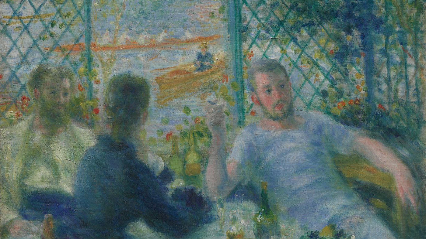 Look closely at how the figures seem to blend almost dreamlike into their surroundings, their features suggested rather than sharply defined. The latticed screens behind them create a decorative pattern that frames the scene, while hints of the river landscape peek through. Renoir loved painting people enjoying leisure time, and there's a wonderful sense of informality here, as if we've stumbled upon friends in the middle of an afternoon gathering. The loose, flowing brushstrokes give the whole composition a sense of movement and life, freezing a fleeting social moment in paint.