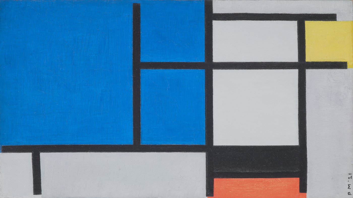 What makes this piece particularly striking is the bold blue plane that dominates the left side of the canvas. Mondrian spent years refining this visual language, and each painting is carefully balanced despite appearing deceptively simple. The thick black lines act like a grid that organizes the composition, while the blocks of color create a sense of rhythm and tension. That small pop of orange at the bottom right and the yellow rectangle at the top keep your eye moving around the canvas, preventing any one area from becoming too static.