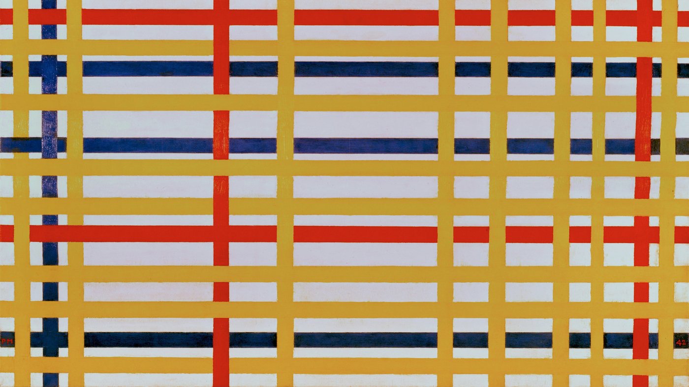 This vibrant grid of yellow, red, and blue lines against a white background shows Mondrian pushing his famous geometric style in a bold new direction. Created after he moved to New York City in 1940, fleeing World War II, the painting captures the energy and rhythm of Manhattan's streets through interlocking bands of color. Unlike his earlier, more static compositions with black lines, here the colored strips seem to pulse and dance, reflecting the jazz music and bustling city life that so excited him during his final years.