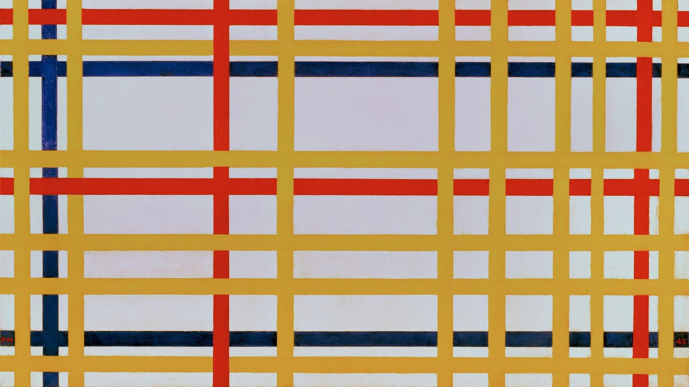 This vibrant grid of yellow, red, and blue lines against soft backgrounds shows Mondrian at his most joyful and energetic. Created during his time in New York City in the 1940s, this painting pulses with the rhythm of American jazz and the buzzing street grid of Manhattan, a dramatic shift from his earlier, more austere work. The overlapping lines seem to dance and weave, creating a sense of movement that feels almost musical, capturing the excitement Mondrian felt after fleeing war-torn Europe for the electric energy of New York.