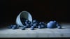 This still life captures the simple pleasure of fresh blueberries tumbling from a delicate porcelain bowl, painted with careful attention to light and shadow. The artist creates a sense of quiet drama through the stark contrast between the dark background and the soft illumination highlighting the fruit's dusty bloom and the bowl's smooth surface. Each berry seems to have rolled naturally into place, giving the composition an effortless, unposed feeling.